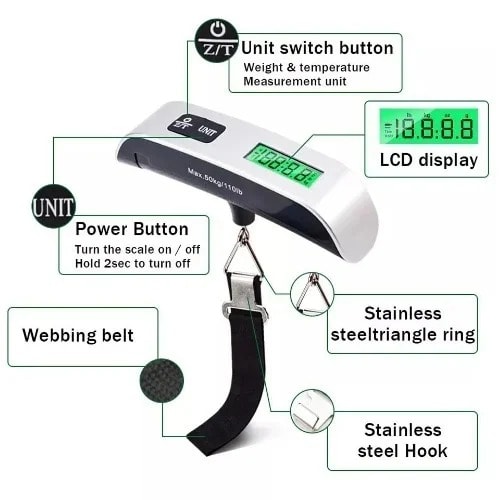 Electronic luggage scale, 50kg Electronic Digital luggage scale, Travel luggage scale, Portable luggage scale. Electronic luggage scale for Suitcase Travel Weighs Baggage Bag Hanging Balance Weight LCD display. Never pay overweight luggage fees again! Electronic luggage scale is great Whether you are planning to go on the road or on the plane, this portable digital luggage scale can help to provide accurate readings of your travel luggage. Electronic luggage scale accurate readings range from as low as 10g/0.02lb to 110lb/50kg. Electronic luggage scale / Digital luggage scale -Equipped with:- Tare function- Data lock- An auto off function, used to help conserve battery life- Easily switch between lb/kg- A temperature sensor (can be used to test outside temperature)Specifications:- Capacity: 50kg/110lb, graduation: 10g/0.02lb- Easy-to-read LCD display (0.44" digits)