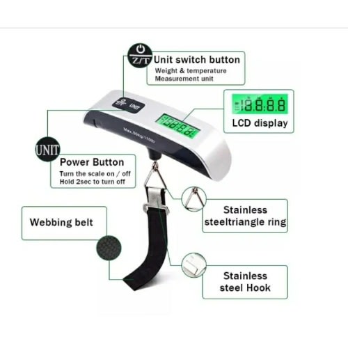 Electronic luggage scale, 50kg Electronic Digital luggage scale, Travel luggage scale, Portable luggage scale. Electronic luggage scale for Suitcase Travel Weighs Baggage Bag Hanging Balance Weight LCD display. Never pay overweight luggage fees again! Electronic luggage scale is great Whether you are planning to go on the road or on the plane, this portable digital luggage scale can help to provide accurate readings of your travel luggage. Electronic luggage scale accurate readings range from as low as 10g/0.02lb to 110lb/50kg. Electronic luggage scale / Digital luggage scale -Equipped with:- Tare function- Data lock- An auto off function, used to help conserve battery life- Easily switch between lb/kg- A temperature sensor (can be used to test outside temperature)Specifications:- Capacity: 50kg/110lb, graduation: 10g/0.02lb- Easy-to-read LCD display (0.44" digits)