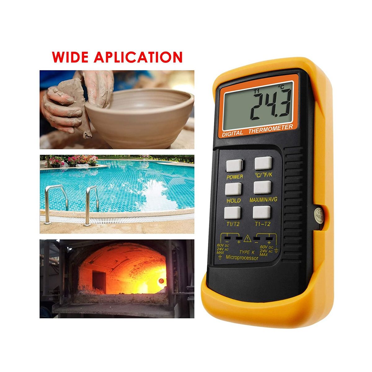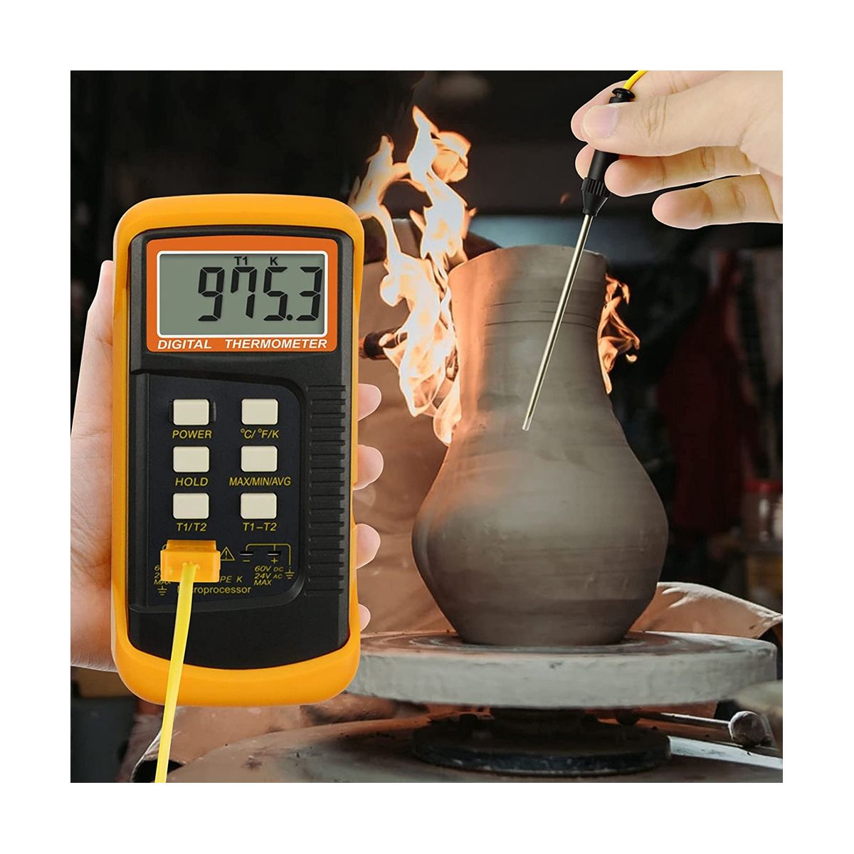 This High Accuracy Digital K-Type Thermocouple Thermometer is perfect for measuring temperatures in a wide range of applications. It offers a temperature range of -50°C to 1300°C with a resolution of 0.1°C and an accuracy of ±0.5%. The thermometer is equipped with dual channels and four probes, making it easy to measure temperatures of multiple objects simultaneously.