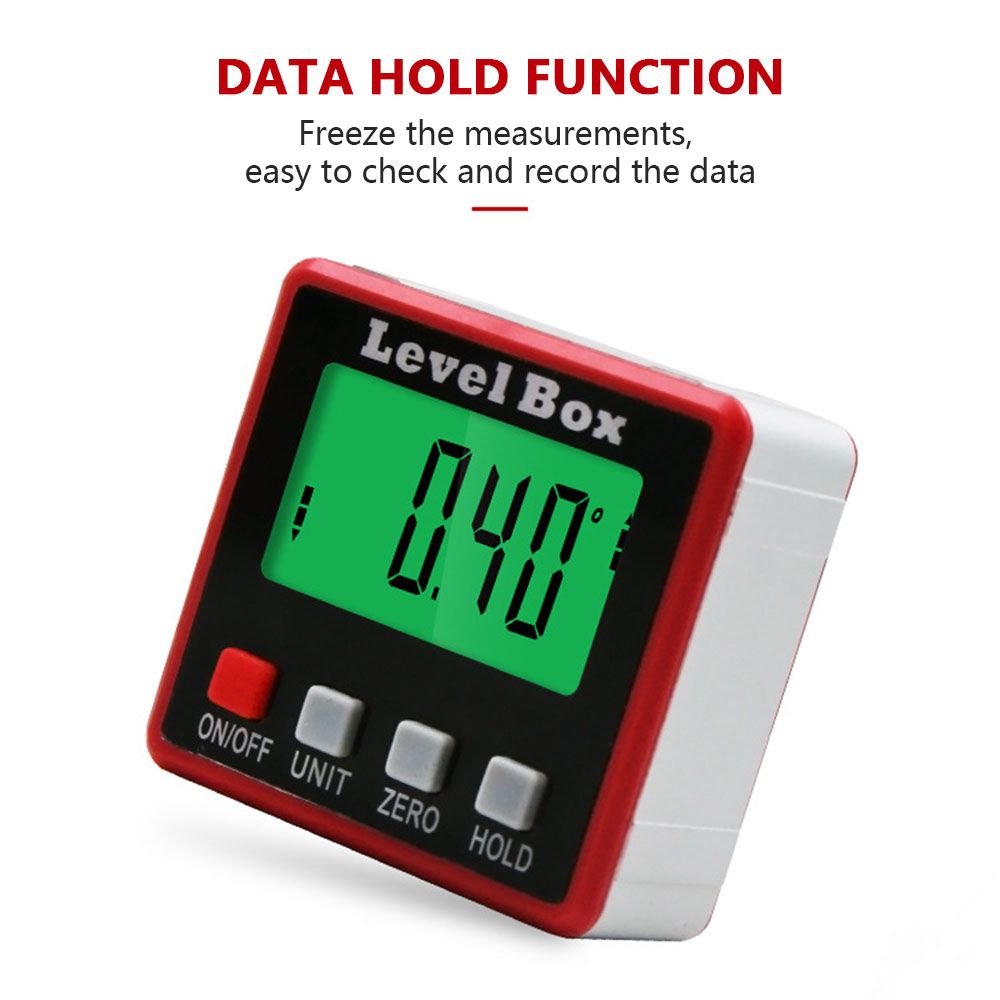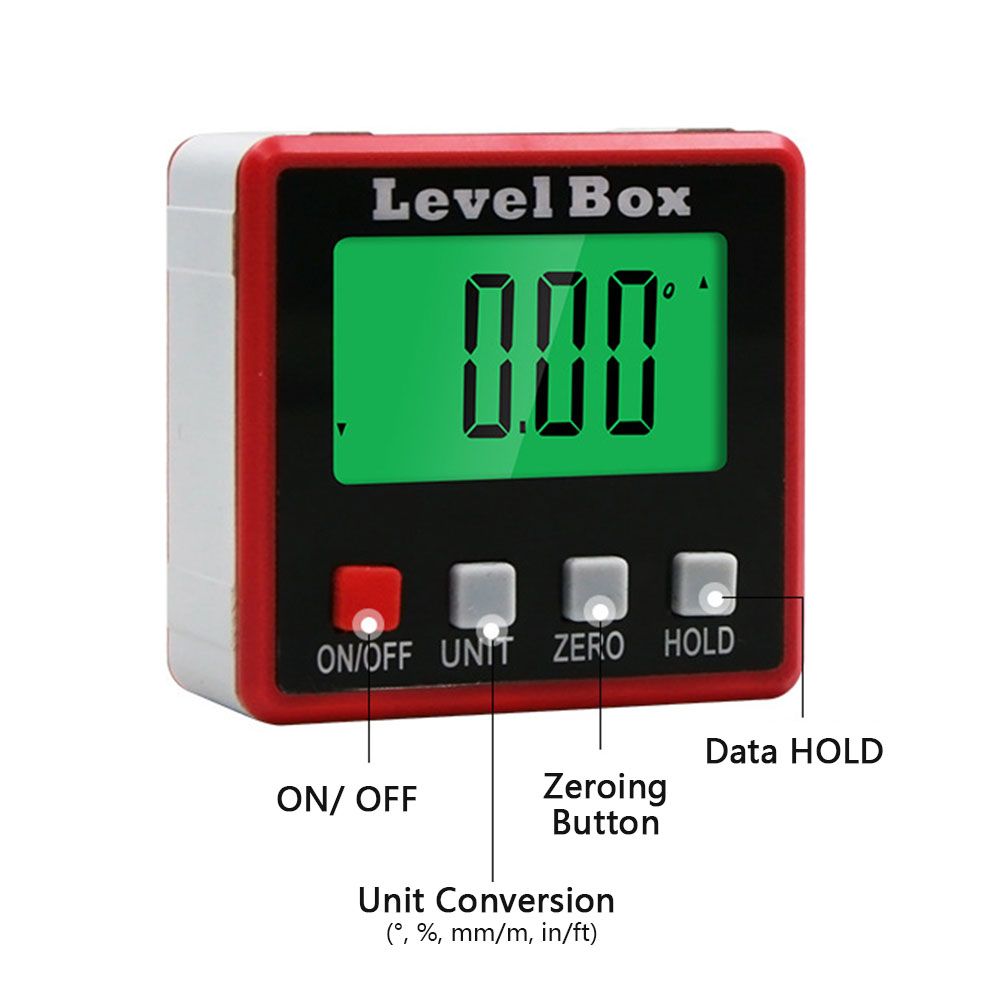 Measuring Range: 4 * 90 deg;; Resolution: 0.1 deg;; Unit: deg;, %, mm/m, in/ft.