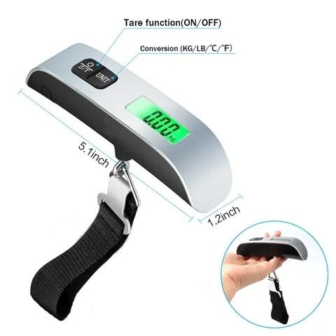 Digital Luggage Scale 50kg Electronic Digital Portable Suitcase Travel Weighs Baggage Bag Hanging Balance Weight LCD Never pay overweight luggage fees again!Whether you are planning to go on the road or on the plane, this portable digital luggage scale can help to provide accurate readings of your travel luggage. The accurate readings range from as low as 10g/0.02lb to 110lb/50kg.Digital luggage scale -Equipped with:- Tare function- Data lock- An auto off function, used to help conserve battery life- Easily switch between lb/kg- A temperature sensor (can be used to test outside temperature)Specifications:- Capacity: 50kg/110lb, graduation: 10g/0.02lb- Easy-to-read LCD display (0.44" digits)- Low battery/over load indication- Power: 1 x 3V CR2032 lithium battery (included)Package Content:- 1 x luggage scale- 1 x 3V CR2032 lithium battery