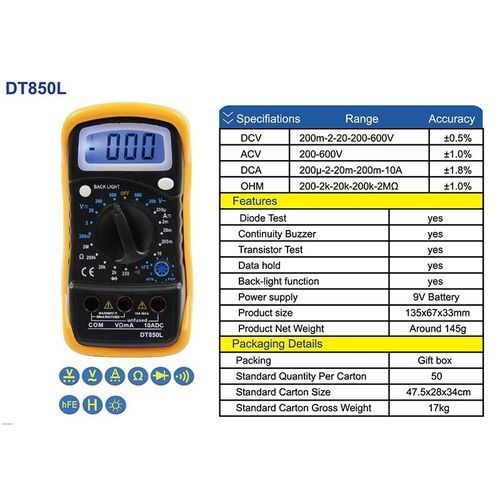 The meter is a held 31/2 digital multimeter for measuring DC and AC Voltage,DC and AC current,Resistance,Diode,Transistor,freguency,trmperature,capacitance and Continuity Test. The Back light of display is optional.