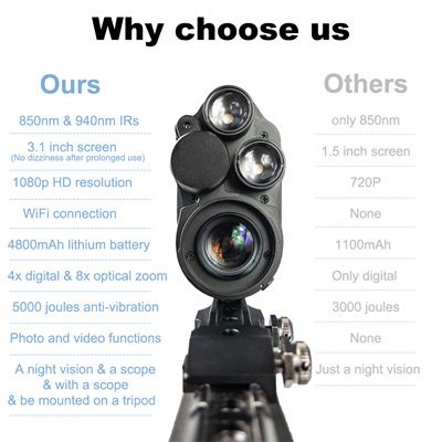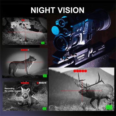 【HIGH AVAILABILITY】A Great night vision which features two Scalable infrared illuminators of 850nm and 940nm that allow you to view animals with tripod in pitch dark.Pulling out the infrared lamp heads can greatly increase the viewing distance. Day & Night Use, 3.1-inch LCD screen and multiple crosshairs making it easy to catch. 4x digital zoom and 8x optical zoom, which can be used directly as a scope or combined with your original scope.