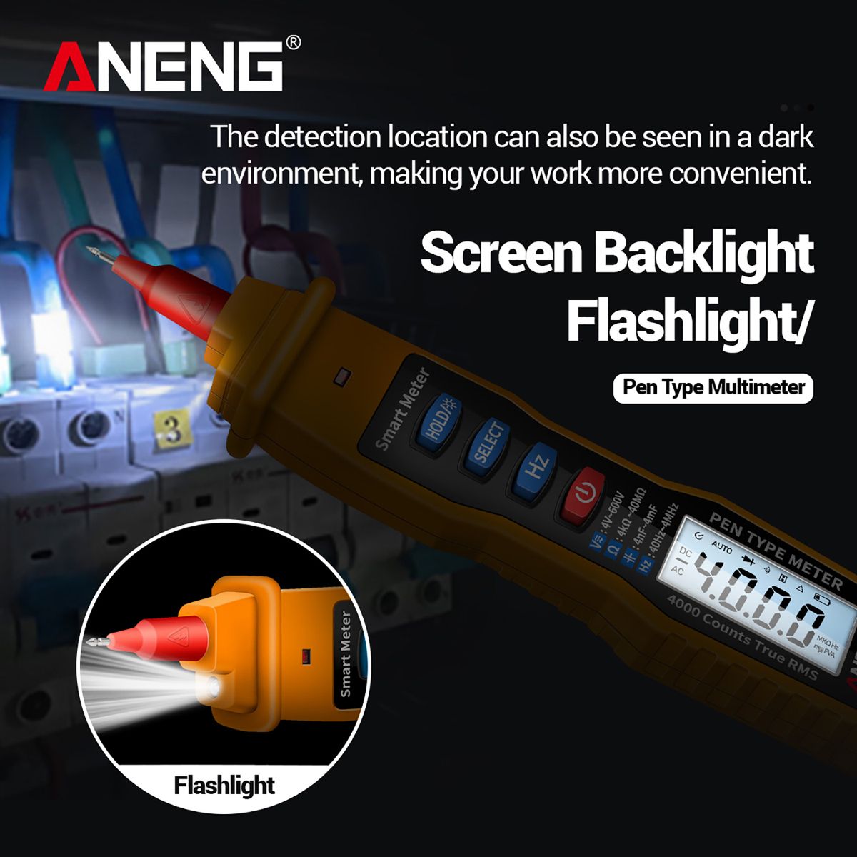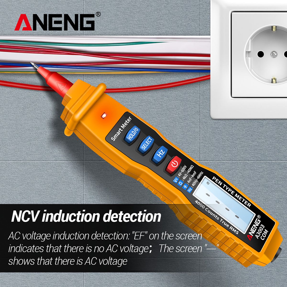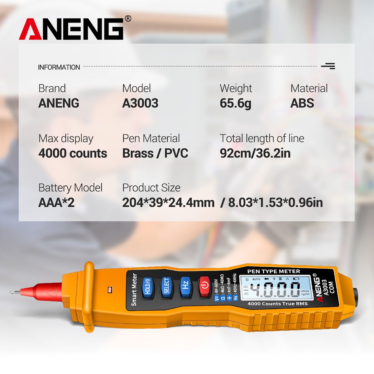 ANENG A3003 4000 Counts Pen Type Digital Multimeter with NCV, AC/ Voltmeter, Ohmmeter, Resistance, Capacitance, Frequency and Live Line Test, The Digital Pen Multimeter also with EF Function and On-Off Detection Support Data Hold. Large LCD screen with Backligt support auto-off function for saving; Buit-in flash light + Audible and Light Alarm, more convenient test and read.