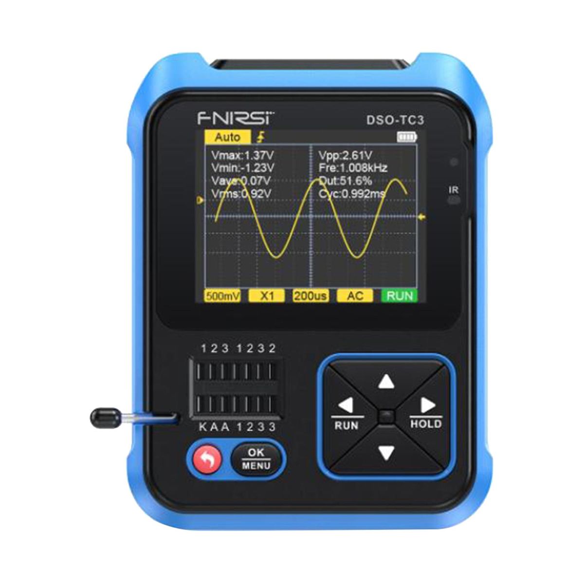 【3 in 1 Handheld 】: Digital , Transistor Tester and Function Signal Generator,Digital : real time sampling rate 10MS/s, 500Khz, maximum measurement 400V.Voltage signal, complete functions (automatic, single, regular), equipped with an efficient AUTO key, can display the measurement waveform without tedious adjustments.