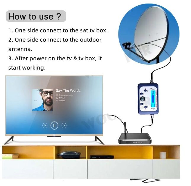 Type: Satellite Signal FinderBody Material: PlasticSize: 130*65*27mmFrequency Range: 950-2150MHzInput level Range: -40~-10dBmImpedance: 75ΩGain: ≥10 dBOperating Temperature: 0~40°