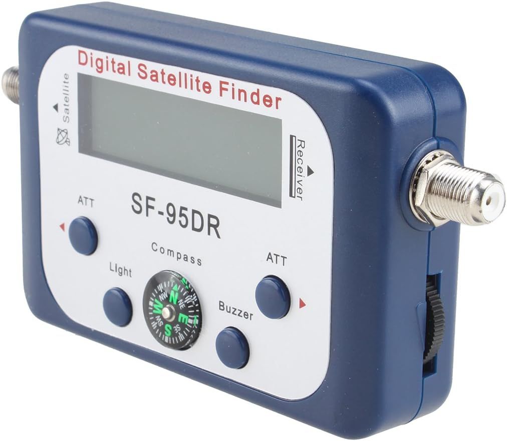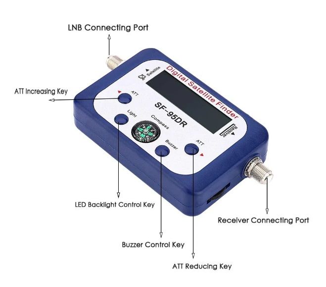 -1 . Built-in IF signal strength meter with Compass, light & buzzer tips, Ideal for satellite installations or to point your satellite dish.-2 . SF-95DR has a blue back light to allow use at night. The signal meter never needs to be recalibrated nor does it need complicated programming.-3 . Use LCD to display the signal intensity, automatically recognizes the LNBF frequency, works with any C, Ku or Ka band satellite. Plug and Play.-4 . Pocket size and light weight, Powered by the TV Receiver, nice tool for campers.