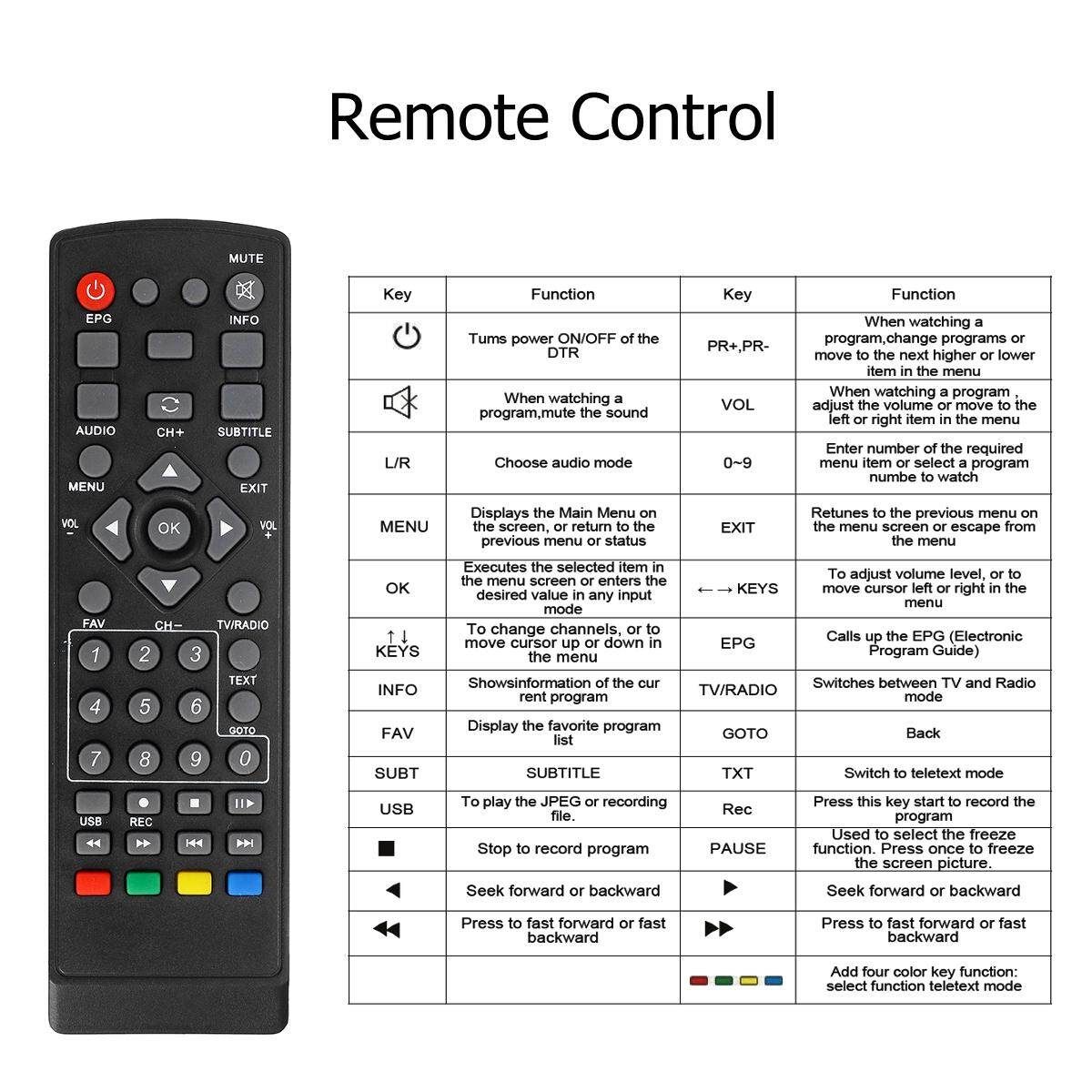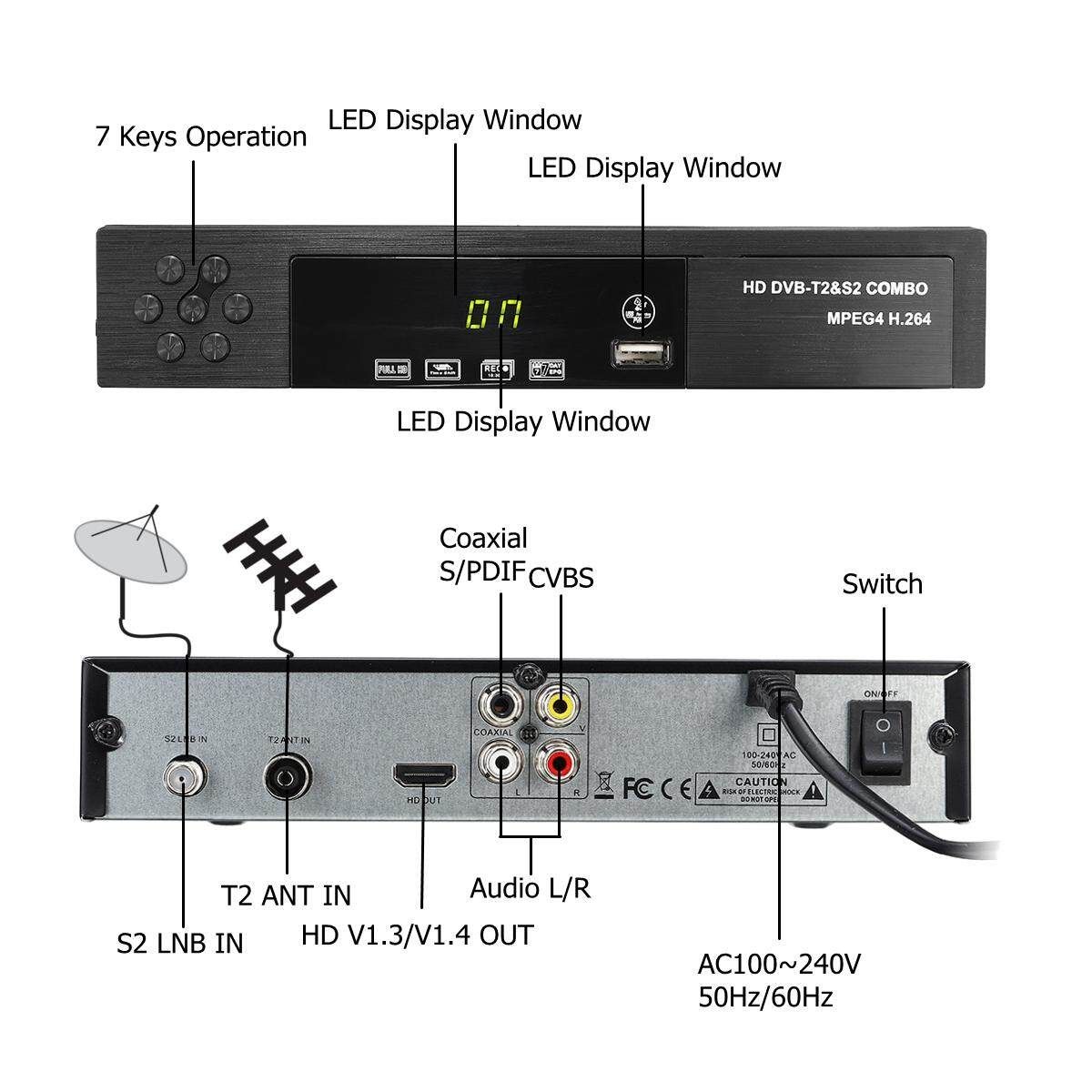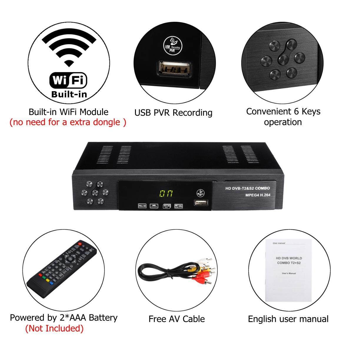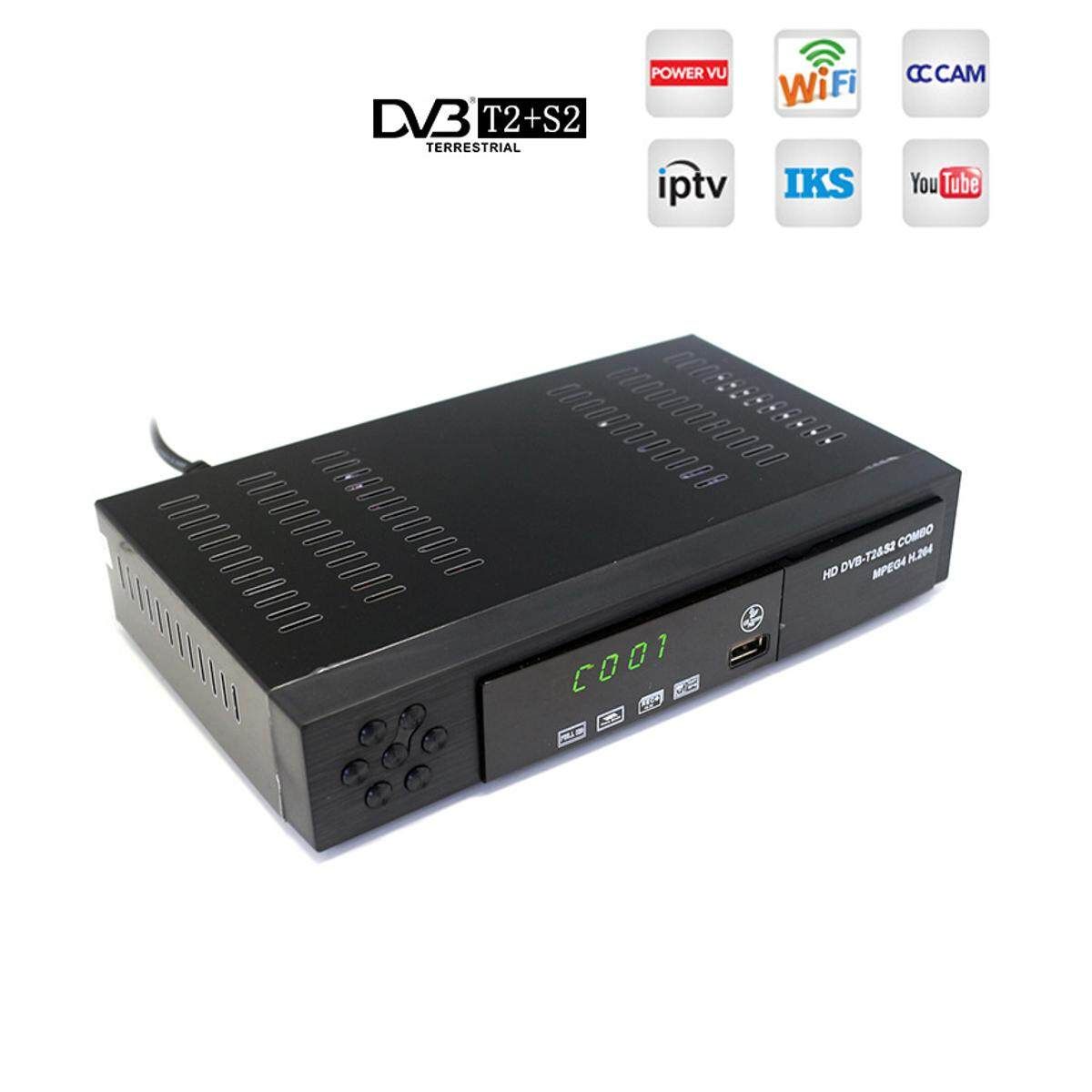 Satellite receiver HD Digital T2+S2 TV Tuner Receivable MPEG4 -T2 TV Receiver T2 Tuner Sortware Features: ?Fully Compliant and H.264/MPEG-2/MPEG-4/AVS ? Full / Blind Search on Single / Multiple Satellites ? Auto / Manual Search on Terrestrial Network ? DiSEqC 1.0 / 1.1 / 1.2 / USALS / Unicable ?Powerful Service Control by Favorites, Lock, Skip, Move, Rename Delete ? 7-day EPG, Event Recording by EPG ? Multi-Language (OSD Menu) ?Maximum 4000 Service Programmable ?TV System: Auto / PAL / NTSC ?Aspect Mode: Auto / 4:3LetterBox / 4:3PanScan / 16:9 ?Video Output Resolution: 480i/576i/480p/576p/720p/1080i/1080P ? Audio Description (Thailand Standard) ? Teletext, Subtitle ? Find / Zoom ? Parental Lock ? Software Upgrade by OTA/USB ?USB 2.0 Host (Time Shift, PVR, MP3 Player Picture Viewer Media Player) Decoder: Video Decoder: MPEG2 MP-ML for SD Audio Decoder: MPEG-1 LayerI Layer II Musicam Powerful Multimedia Features: Media Codec:mpeg2, m2ts, ts, avi, mkv, asf, 3g2, 3gp, mp4, mov, flv, f4v, vob, dvix Audio Codec:wav, mp3 Photo Codec:jpeg, gif, bmp, png Specifications: Model :-T2+S2 COMBO Hardware: CPUMontage:CT6001 Memory:32X16Mbit DDR2 f-400MHz Flash:4M bytes S2 TUNER:M88TS2022 T2 TUNER:M88TC800 Front Panel: USB 2.0 Embedded One Host, 4-digit LED display on front panel red LED Standby,green LED Lock Panel KEY, , CH+ ,CH- Rear Panel: S2 LNB IN input connector:IEC60169-2 T2 ANT input connectorIEC-162-2(IEC Female) HDMI V1.3 RCA CVBS AL AR Connector x1 Ypbpr RCAx1 Coaxial x1 AC100~240V 50Hz/60Hz -T2 Demodulation: Terrisal Receiver Standard -T2/T(EN_302755 V1.3.1/EN 300744) Input Frequency 48~866MHZ Bandwidth6MHz,7MHz,8MHz Constellation QPSK 16-QAM 64-QAM and 256-QAM FEC 1/2, 3/5,2/3, 3/4,4/5,5/6 Guard Interval1/128 1/32 1/16 19/256 1/8 19/128 1/4 FFT Mode 2K/ 8K/32K Single and multiple PLPS Input level -83~ -5dBm -S2 Decoder: Frequency Range950MHz-2150MHz Sensitivity Level - 10~ - 81dBm Mode IFFT:2k,8k FEC Mode: 1/4, 1/3, 2/5, 1/2, 3/5, 2/3, 3/4, 4/5, 5/6, 8/9, 9/10 Guard intervals: 1/4,1/8,1/16,1/32 Constellation: QPSK、8PSK、16APSK Neighboring channels:According to ETSI TR 101 190 V1.2.1 Active Ant :13/18V - 500mA ,Overload Protection Package Included: 1 x Smart TV Box 1 x AV cable 1 x High Definition Multimedia Interface cable 1 x IR remote control 1 x User Manual 1 x Gift box