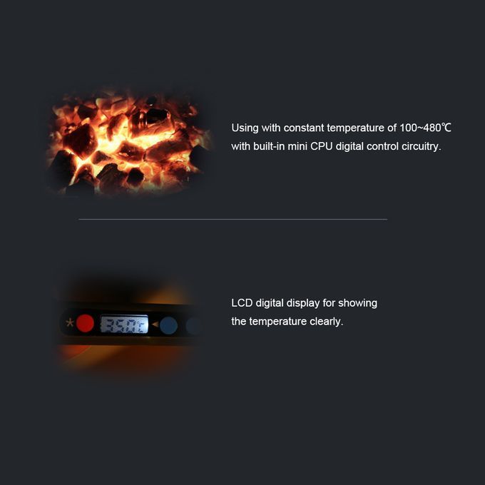Using with constant temperature of 100~480℃ with built-in mini CPU digital control circuitry.LCD digital display for showing the temperature clearly.Thermostatic control effectively reduce the harm for circuit bpard. The tip with quick temperature induction sharply reduce the temperature drop phenomenon of the welding nozzle.No feeling of fatigue for long period of operation with light and handy body.