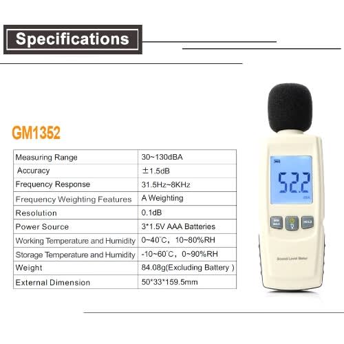 Measuring Level: 30-130dB (A) , 35-130dB (C)Level Ranges:30-80dB50-100dB60-110dB80-130dB30-130dBAccuracy: & plusmn;1.5dB (under reference conditions)Resolution: 0.1dBFrequency Range: 31.5Hz to 8.5KHzLinearity Range: 50dB/100dBBar Graph50dB scale at 1dB step for monitoring current sound pressure levelSample Rate: 20times/secondOverload Indication: OVER/UNDERFrequency Weighting: A and CDigital Display: 4 digitsAC Signal Output: 0.707Vrms at FS output impedance approx. 600 & Omega;(ohm)DC Signal Output: 10mV/dB, output impedance approx. 100 & Omega;(ohm)Time Weight: FAST / SLOWMicrophone: 1/2" Electrinic Condenser microphoneMax hold function: YesOperating Condition: 0~40 & deg;C, 10~80%RHStorage Condition: -10~60 & deg;C, 10~70%RHPower Supply: 4 x AA 1.5V alkaline battery (included) or DC 6V 100mA (maxumim DC9V) (not included)Battery Power Life: About 30 hours (alkaline battery)Size: 256 x 70 x 35mmWeight (Meter with Sponge Ball/Windscreen Filter): 230g (excluding batteries)