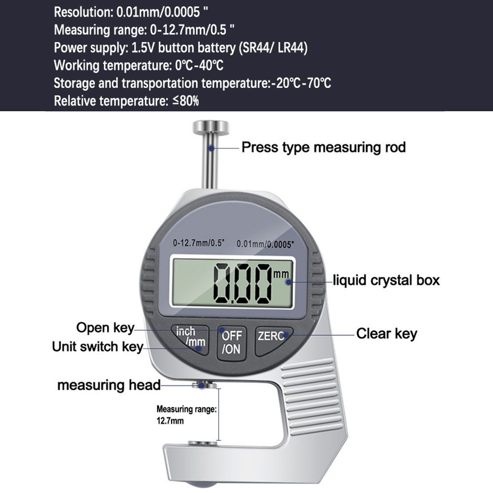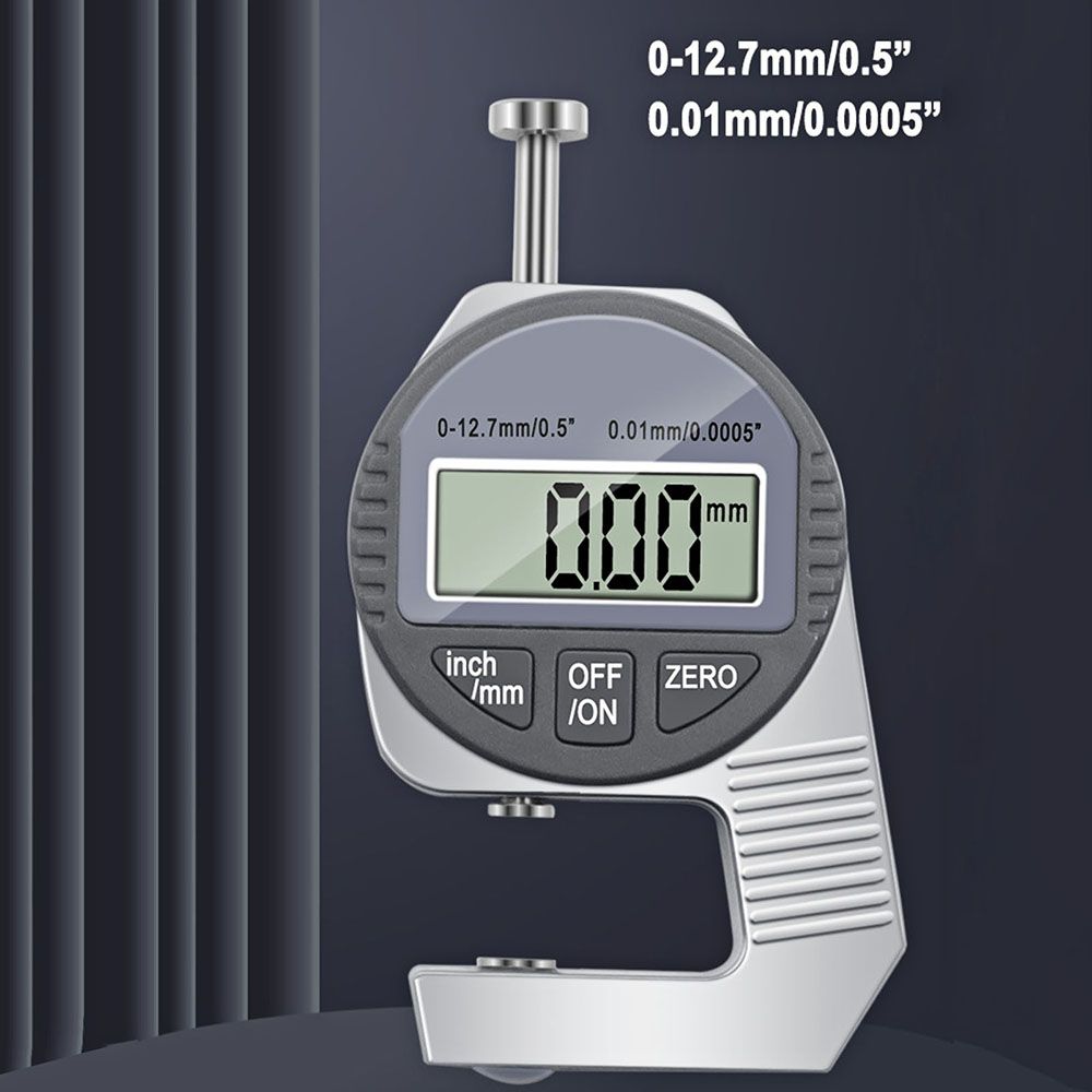 Thickness gauge measures 0-0.5 quot; (0-12.7mm) with 0.0005 quot; resolution.