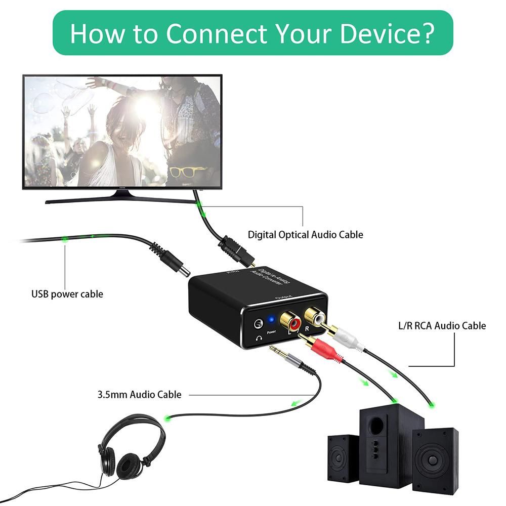 [Easy to use & Simple Settings]Connect the optical or coaxial cable to the signal source and converter, and then connect the RCA or 3.5mm audio cable to the output device and converter. Please set the audio format to uncompressed 2-channel LPCM or PCM in your TV or other source devices. (Note: 5.1 channel is incompatible, please set the audio output to PCM or LPCM: Setting-Sound-Audio Format-PCM/LPCM)