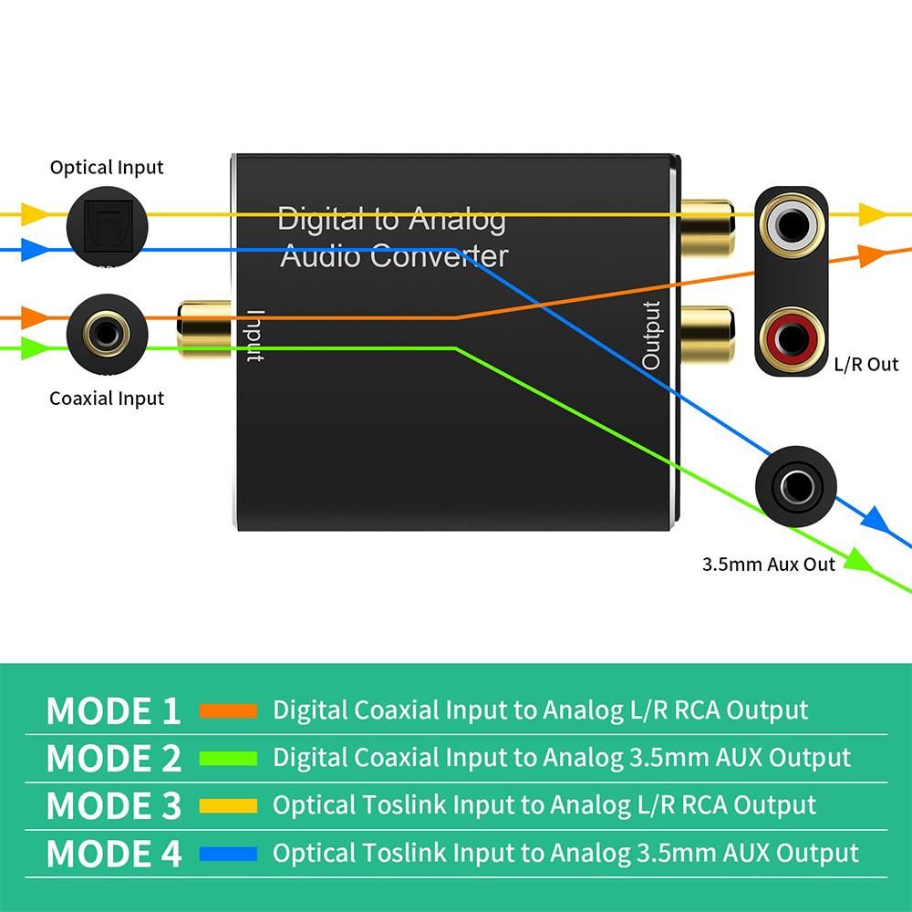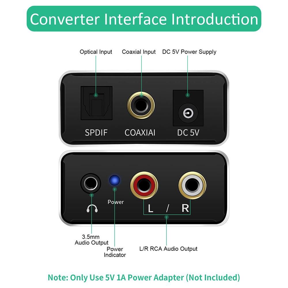 [Digital to Analog Audio Converter]Simple solution to convert coaxial or digital optical audio input to analog stereo L/R RCA and 3.5mm audio signal output. Make sure to change the audio output format to PCM or LPCM. (NOTE: It is only a Digital to Analog Audio Converter, not an Analog to Digital Audio Adapter, input and output cannot be reversed.)