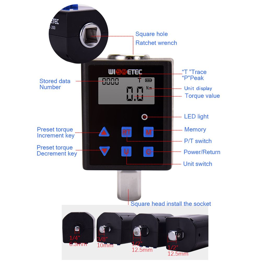 Digital torque meter for various kinds of tightening and dismantling control, with easy operation, simple and lightweight, multi-unit conversion, audible alert, adjustable in clockwise and reverse directions, etc. Used in conjunction with a common ratchet, the torque handle can be used as a digital torque handle with the same functions as the digital torque ratchet. (Handle to be purchased separately)