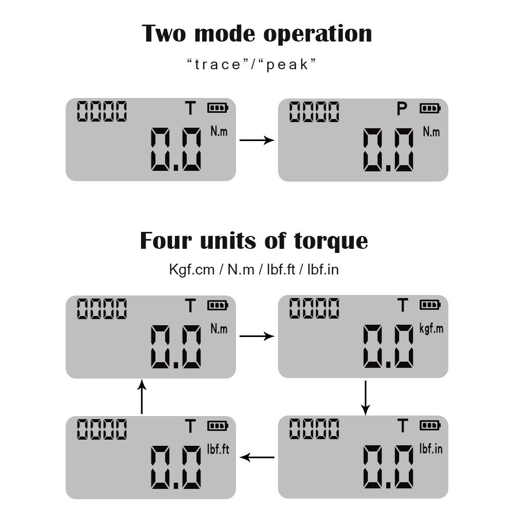 Four units are available, you can adjust between Kgf.cm, N.m, Ibf.ft and Ibf.in depending on your needs.
