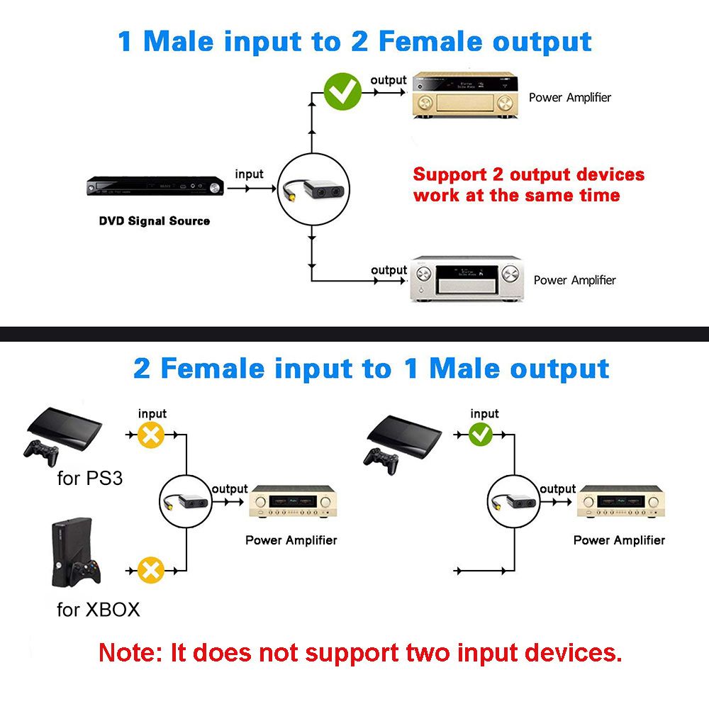 Note: If 2 Female inputs to 1 Male output, they can\'t work together at the same time.
