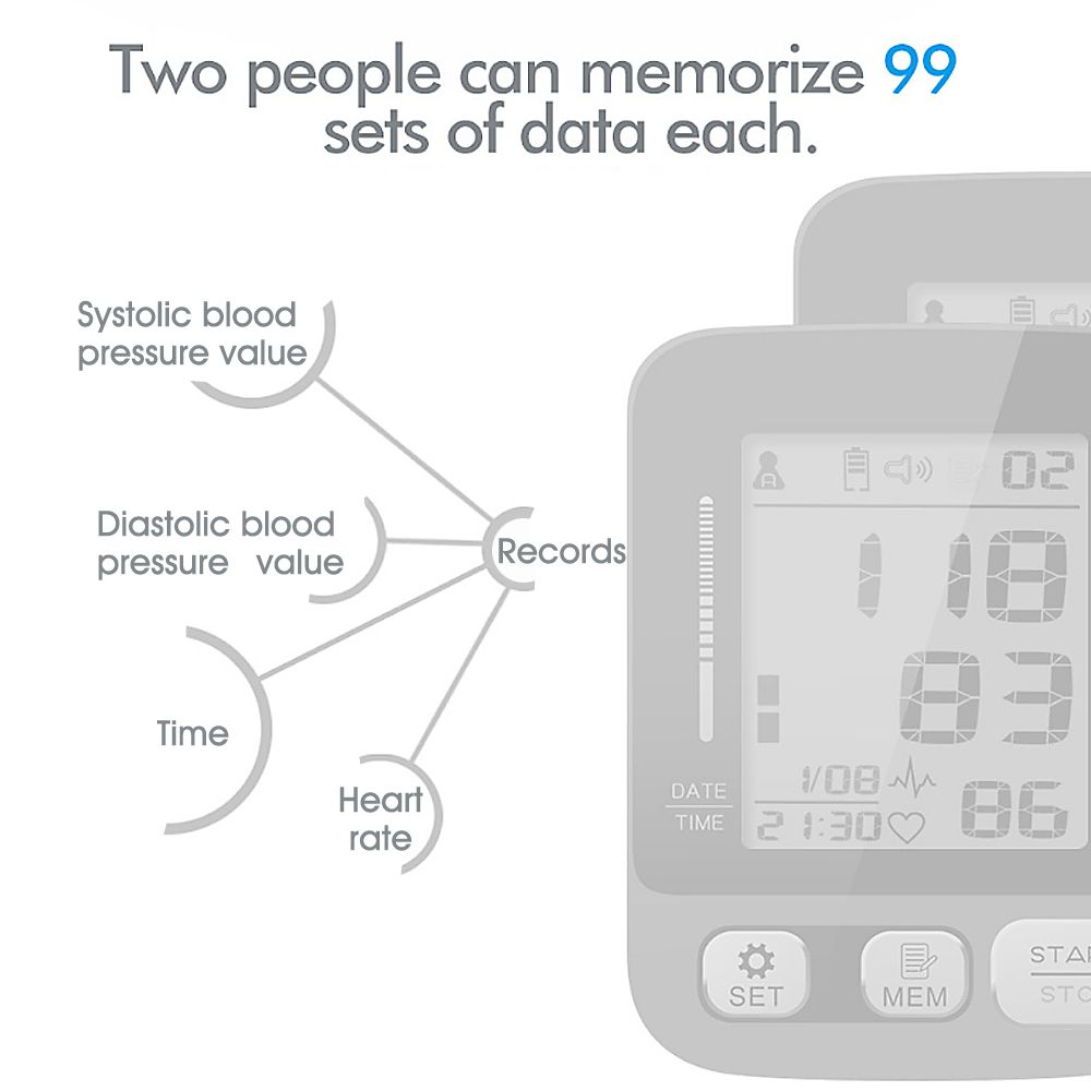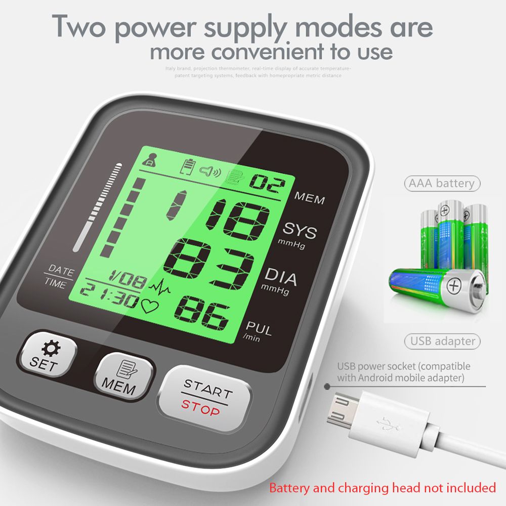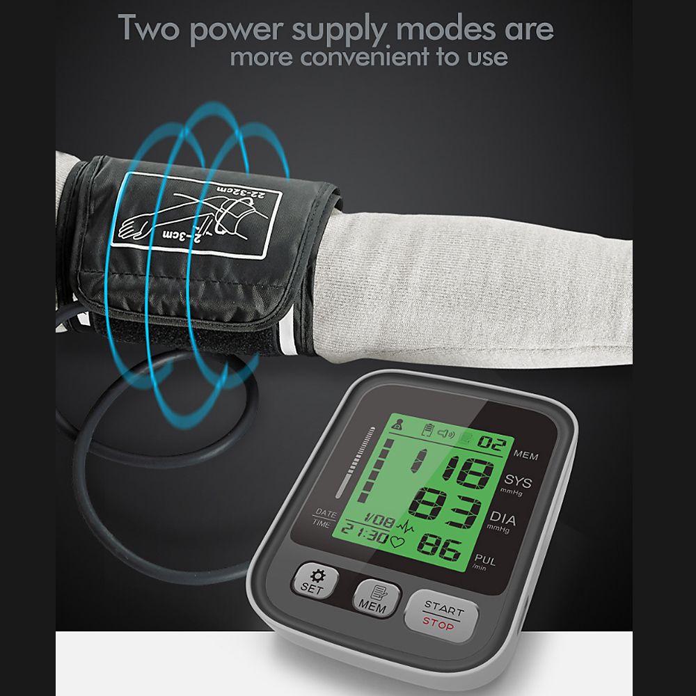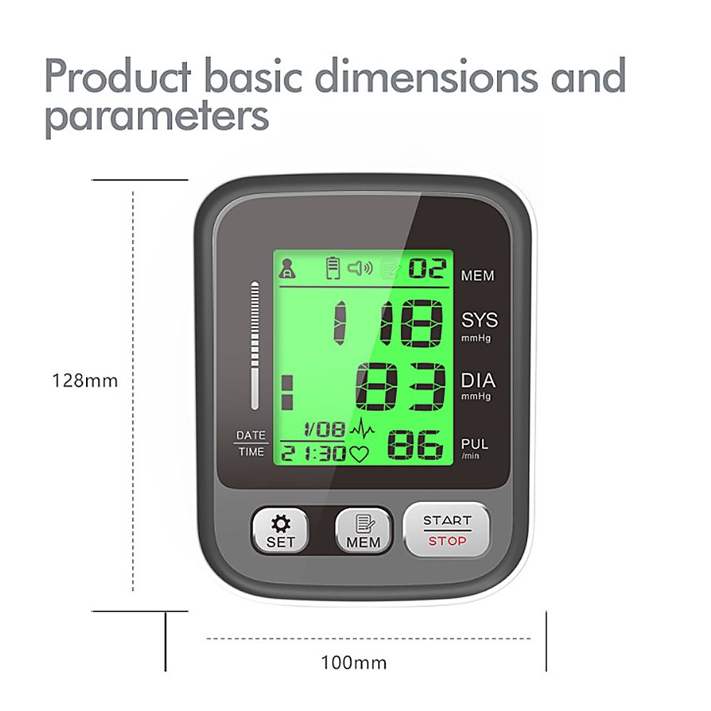 2.Features: Legible LCD digital display, 3-color backlight indicator and intelligent voice function are convenient for elderly people use Easy to use, fully automatic, assume proper sitting position, wrap the cuff around your upper arm, just click the button can get your Systolic/Diastolic blood pressure and pulse result Two users have their own independent measurement records, each user can record up to 99 measurements The BP cuff fits standard and large adult arms providing the most accurate and comfortable during the measurement process Auto-off after no operation in 1 minute When the air pressure exceeds 295mmHg-20ms, it will automatically and quickly exhaust for safe and reliable use Two power supply methods that can be powered by 4*AAA battery/USB cable(Not included)