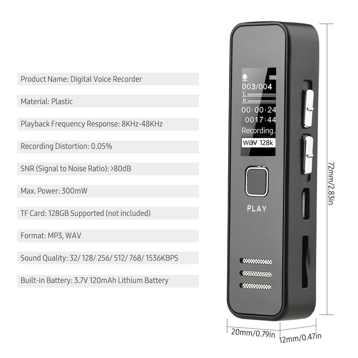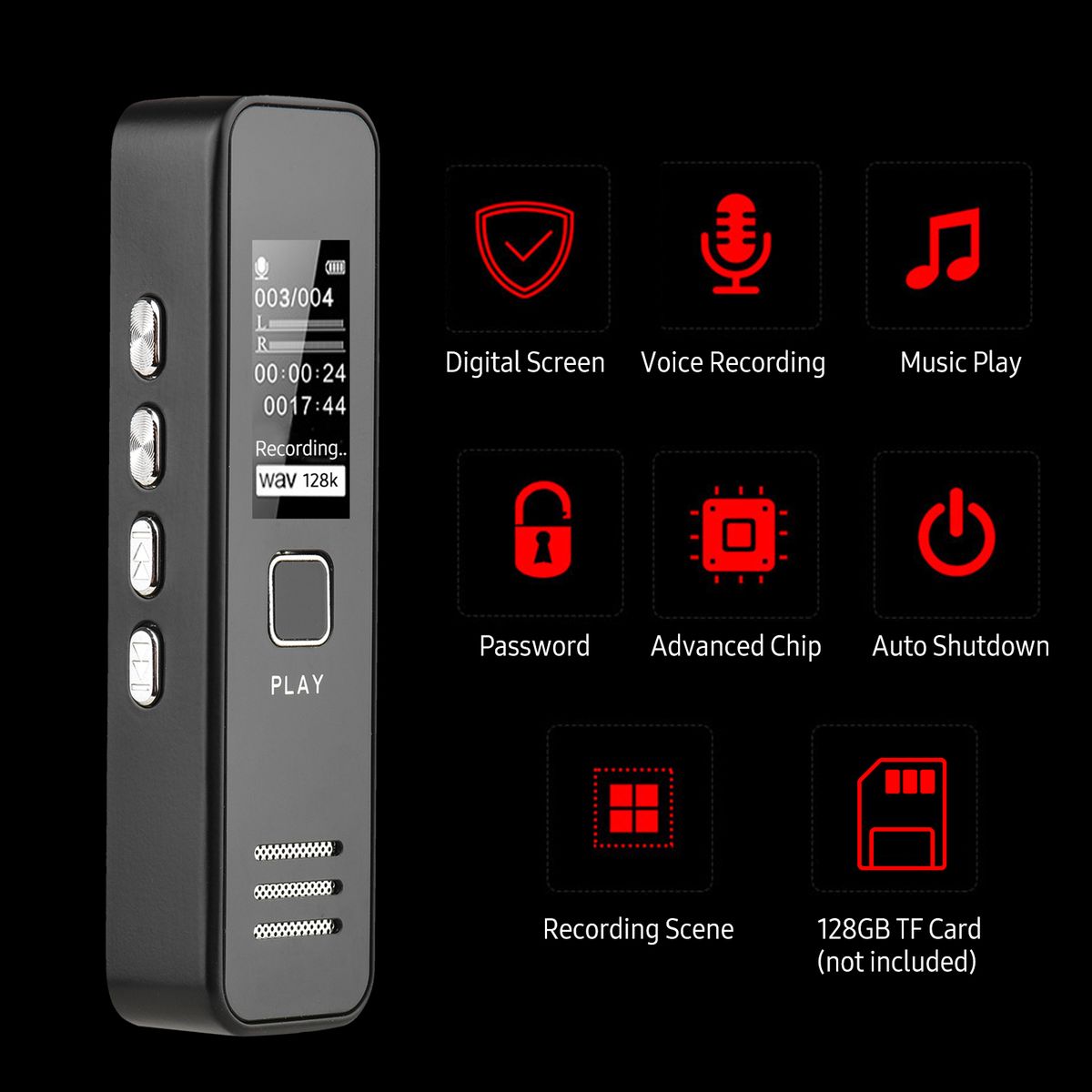 Digital voice recorder supports up to 128GB TF card and is easy to use. It has recording and music playing mode, can meet different needs in real life. Compact and lightweight, cordless and rechargeable, it's a practical tool in work and daily life.