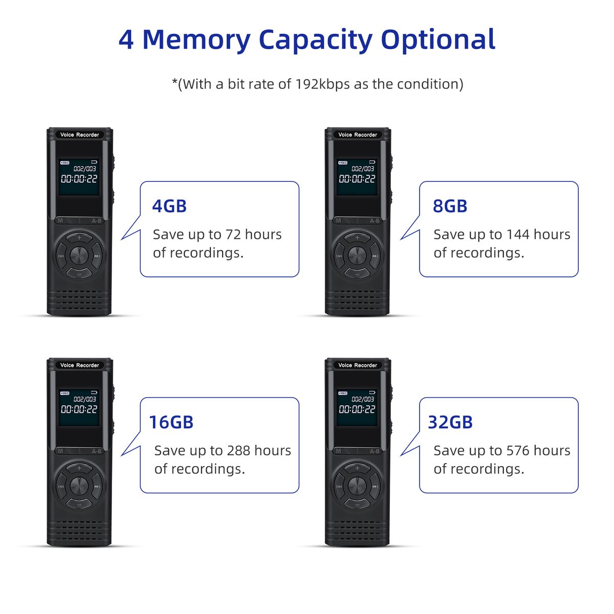 Features:Handheld Recording Quality - MP3 format recording and 192kbps sound quality. Start or save a recording with just one key, easy to operate. 4 TF cards with different storage for optional - 4GB (72hrs Storage Time), 8GB (144hrs Storage Time), 16GB (288hrs Storage Time) and 32GB (576hrs Storage Time).