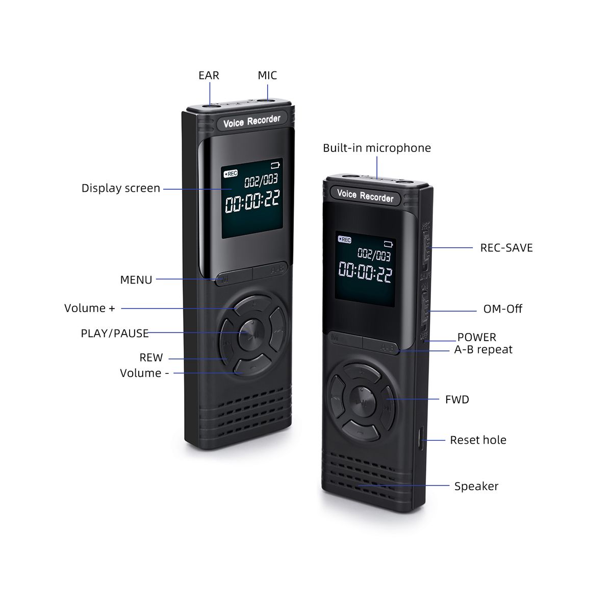 Voice Control/Line-in Function - Comes with voice control function, Turn it on and will auto recording when there have sound. Support line with other equipment such as telephone to recording. Adjust the volume, fast-forward and fast rewind, and A-B repeat operation functions you can operate.