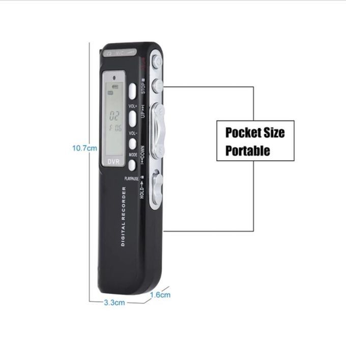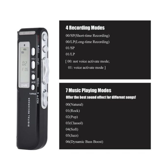 Features:1.Digital recorder with LCD screen, one press to start stereo recording, 192kbps for clear and natural sound effect. 2.Comes with telephone adapter, can record high quality telephone conversation. 3.01/LP and 01/SP recording mode support voice activate function(VAR), suitable for long time recording.4.8GB flash disk support up to 576 hours long-time recording, 96h short-time recording. 5.Powered by 2 * AAA battery, 100mAh can offer 10h service time (for example). (Battery is not included.)6.Support Record Playing / Loop / A-B Repeating / Skip Forward/Backward / Pause / File Delete. 7.7 music playing modes, natural/pop/rock/classol/soft/jazz/bass boost, for the most excellent sound.8.With built-in microphone and speaker, comes with extra mic and earphone. 9.Perfect for lecture, meeting, interview or discreet recordings.