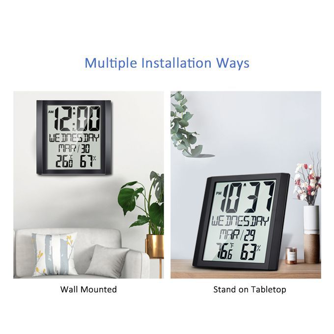 Multiple Data Display: Displays time, date, week, the current temperature and relative humidity. Large fonts for clear reading.