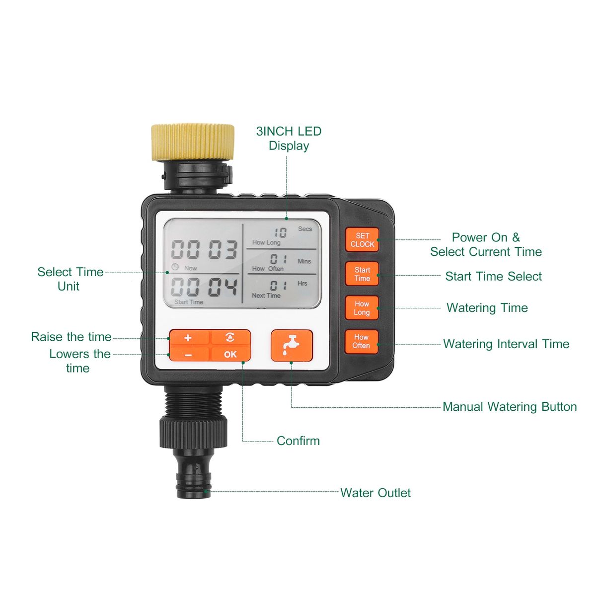 The digital programable water timer can set irrigation program for garden irrigation. Help you take precision care for your pts and save your time and money. High quality ABS shell great for oudoor use. Features: Digital Programmable Water Timer --- Allow wider range of run time and interval. The watering duration ranges from 1s to 99Hrs, and irrigation interval from 1h to 99Hrs. That can make you watering schedule fully customizable and could cooperate with the law of pt growth and create a more beautiful dscape. Easy Read 3in Screen --- Bright, vivid, and easy-to-read large 3inch LED Display all details makes programming easy as ABC! With bar-graph battery strength indicator so that you can aware of the available power. Simple Operation --- All function with there own control button, and marked with detail name, you can freely set your watering schedual, no worry about how to set Sencods, Mins and Hrs. Manual Work Mode --- A manual button allows instant faucet use without interrupting your set program. Your Garden Helper --- This hose timer ideal for irrigation applications in gardens, yards, greenhouses, flowerbeds, and etc. Specification: Material: ABS Color: Black + Orange Faucet Connection: EU = UK / US (optional) Water Preure: 3-8bar Water Temperature: 0-50 degree Power Supply: 2 x 1.5V AA Battery (not include) Button setting instructions: SET CLOCK: Setting Current Time START TIME: Select what time you would like watering to START HOW LONG: Determine how long to water HOW OFTEN: Choose how often you will water OFF: Turn off all watering Note: Please allow 1-3mm differs due to manual measurement. Due to the different display and different light, the picture may not show the actual color of the item. Thanks for your understanding. Packing List: 1 * Water Irrigation Timer
