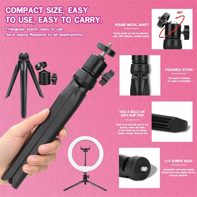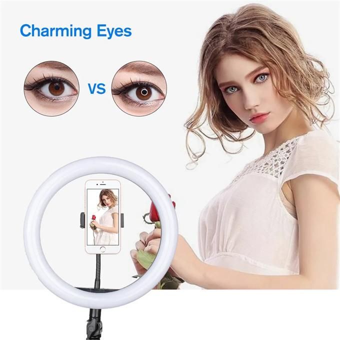 Product short description:Dimmable 26cm LED selfie ring light with tripod and phone holder for makeup/live streaming