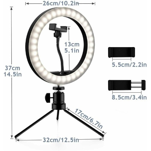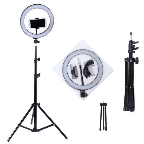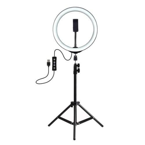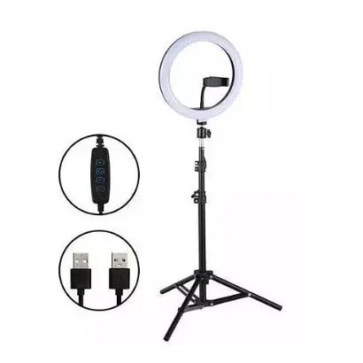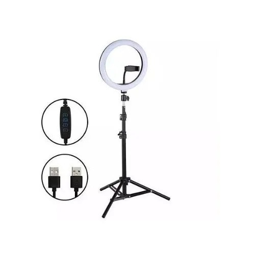 Ultra-thin design stylish appearance, 360 -free light source, Wide-angle light distribution, USB power Supply.10 inch ring right Voltage : 5V Power : 8-10W Power Supply : USB supply Charge Power : DC5V Weight : 0.6kg Trend : 1/4 universal thread.Wire length : 2M Outside Circle Size : 26 cm inside circle size : 20cm beads QTY : 120 Colour tones : warm light/mix light/ cold light color temperature : 3000-6500k color rendering index : 96.Material : PLastic and Aluminum Max.tube Diameter : 26mm Loading Capacity : 1kg Weight : 460g Section : 4 Folded Height : 52cm Max Height : 170cm Min Height : 55cm Top screw : 1/4inch Colour : White.Led ring led Bring LED backlight makes your shorts stunning & ndash; tripod A tripod allows you to get 170 cm of height when unfolded & ndash; ball head Rotation angle 360 degrees & ndash; holder Place your smartphone in a holder so that you don & rsquo;t have to hold in your hands & ndash; remote Make selfie more convenient.