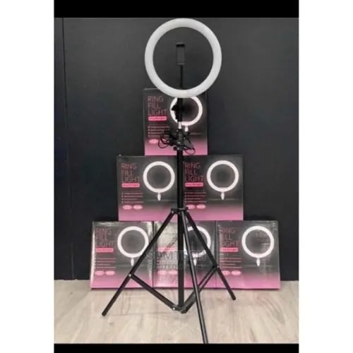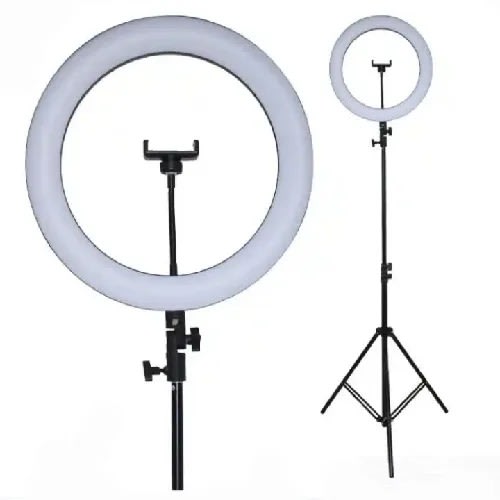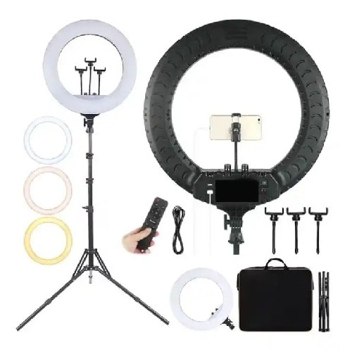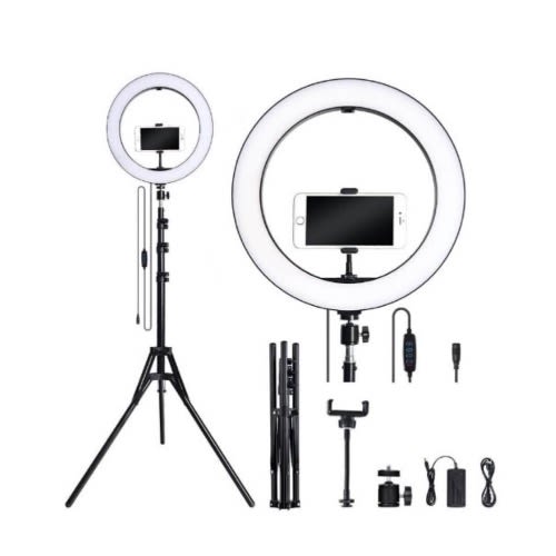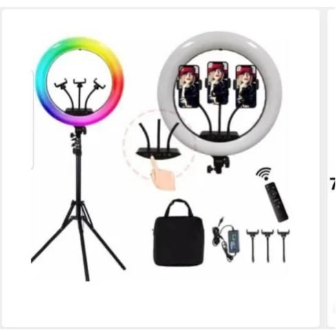 # a tripod ring light stand with height of over 6 feets. # A phone holder # a 360 rotator to enable portrait and landcape position of your phone# 18 inches rechargeable space led model usb ring light.