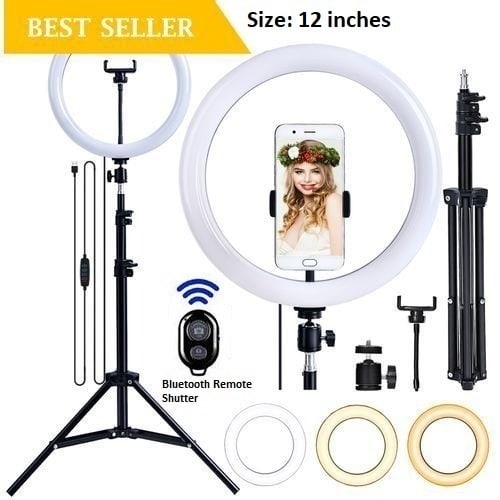 12 inch Selfie Ring Light with 76 inch Tripod Stand & Cell Phone Holder for Live Stream, Makeup, YouTube Video, Photography TikTok, & More Compatible with Universal Phone (Black)Dimmable Ring Light: Featuring 3 color lighting modes: Warm Light, Cool White, and Day Light. Ring light will meet all your needs in different circumstances. It is the perfect dimmable lighting to take away all the unflattering shadows.