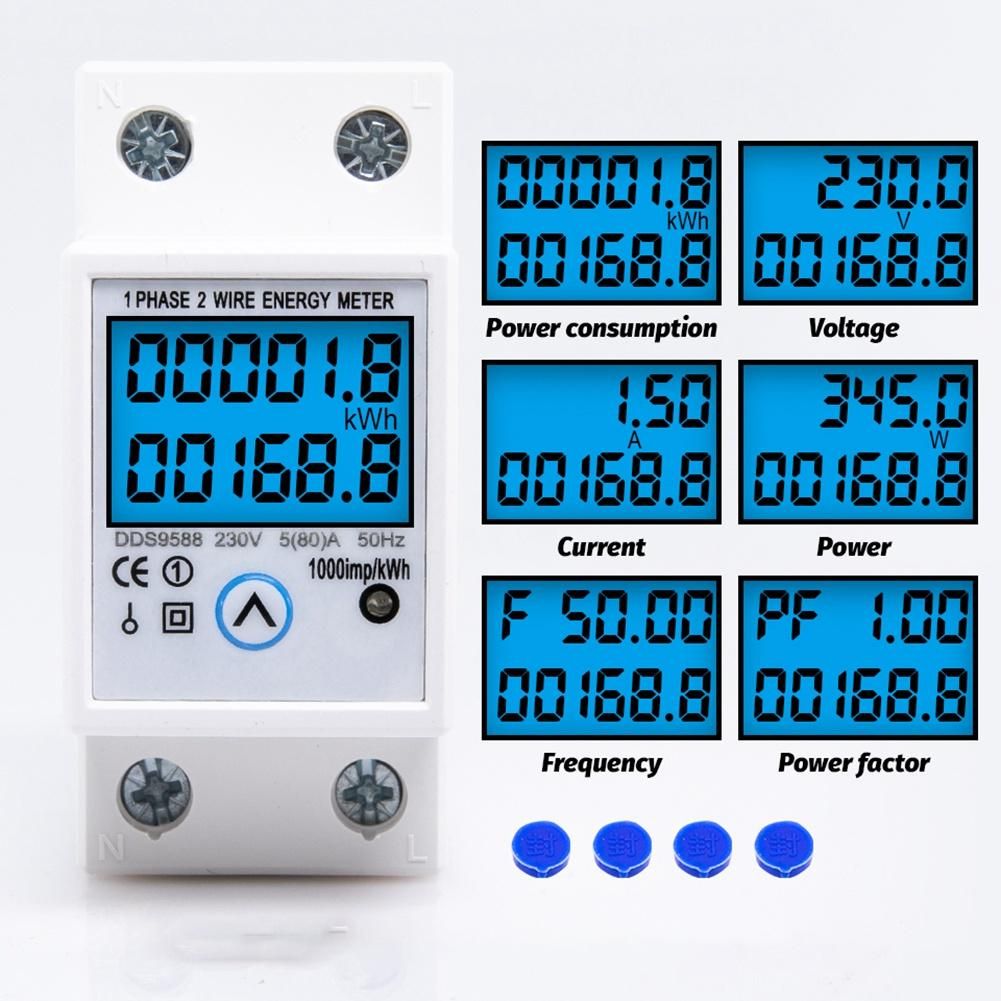 35mm Din Rail installation The meter is multifunctional display total Energy kWh, temporary Energy kWh, real Voltage, real Current, real Power by manual pressing. Hold the button for 6 seconds to Reset the temporary kWh
