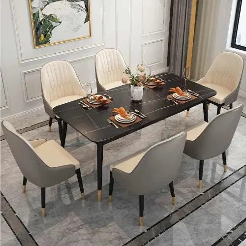 The dining table has a plain glass top of 15mm. This Exquisite Dinning Table comes with six chairs made of strong leather material.