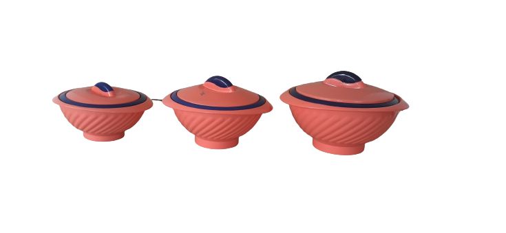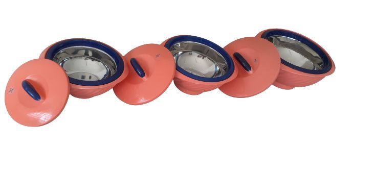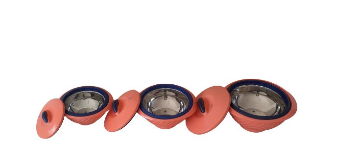INSULATED CASSEROLES WITH STAINLESS STEEL INNER , KEEPS YOUR FOOD HOT . SIZE : 1000 ML , 2000 ML , 3000 ML . 3 PCS OF SET .
