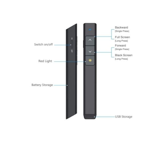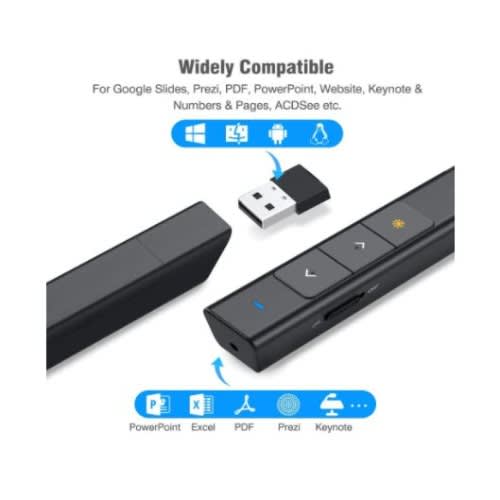 Introducing the ultimate presentation companion, Dareu's 2.4Ghz Wireless Presentation Remote boasts a powerful red laser pointer, along with page up/down, volume control, slideshow start/stop, and blank buttons. This plug-n-play solution includes a wireless USB receiver for effortless connectivity to any PC or Macbook.