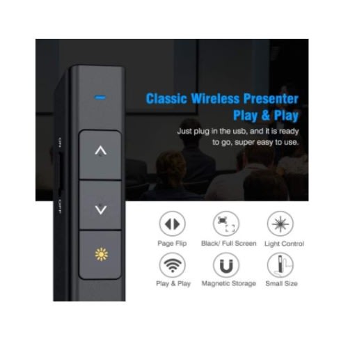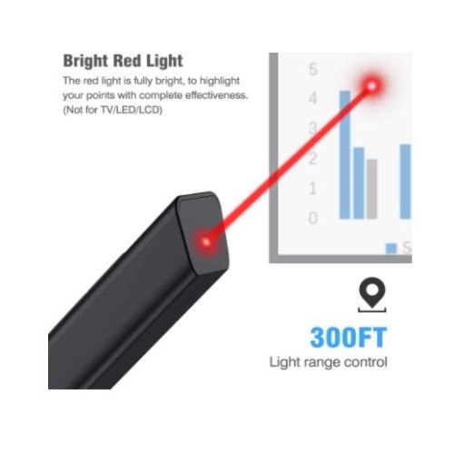 Green Laser: Wireless presenter with the green laser which is better for showing up on variety of backgrounds, bright green light helps you to clearly point things out to people, the presentation remote with green laser is 10 times brighter than red. Rechargeable Battery: The internal battery lasts quite a bit and it's easy to recharge, charge 1 hour to provide weeks of use, not having to bother with constantly replacing batteries.Wireless Range: The clicker for PowerPoint presentations remote range up to 30 meters, so you can walk around the room instead of standing by your computer switching slides, allows for a smoother and more dynamic presentation.Multimedia: Multimedia function include page up/down, volume+/-, play slides, black screen.