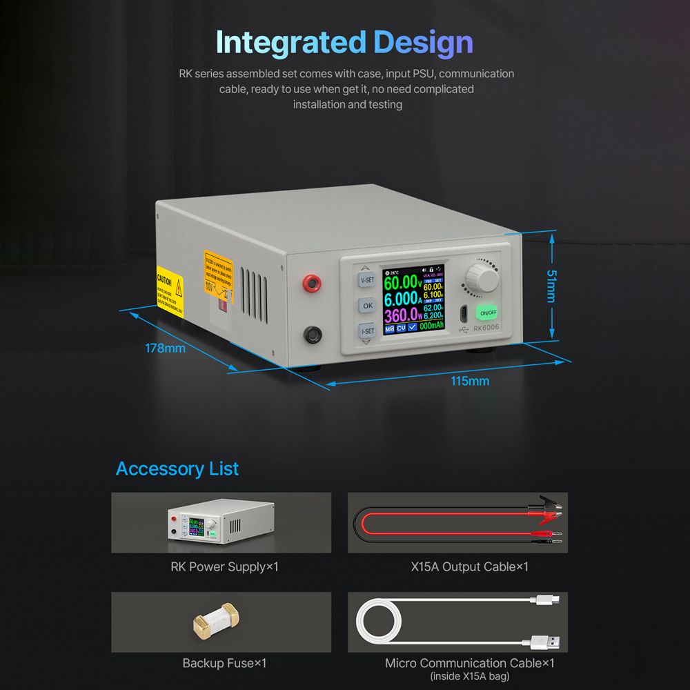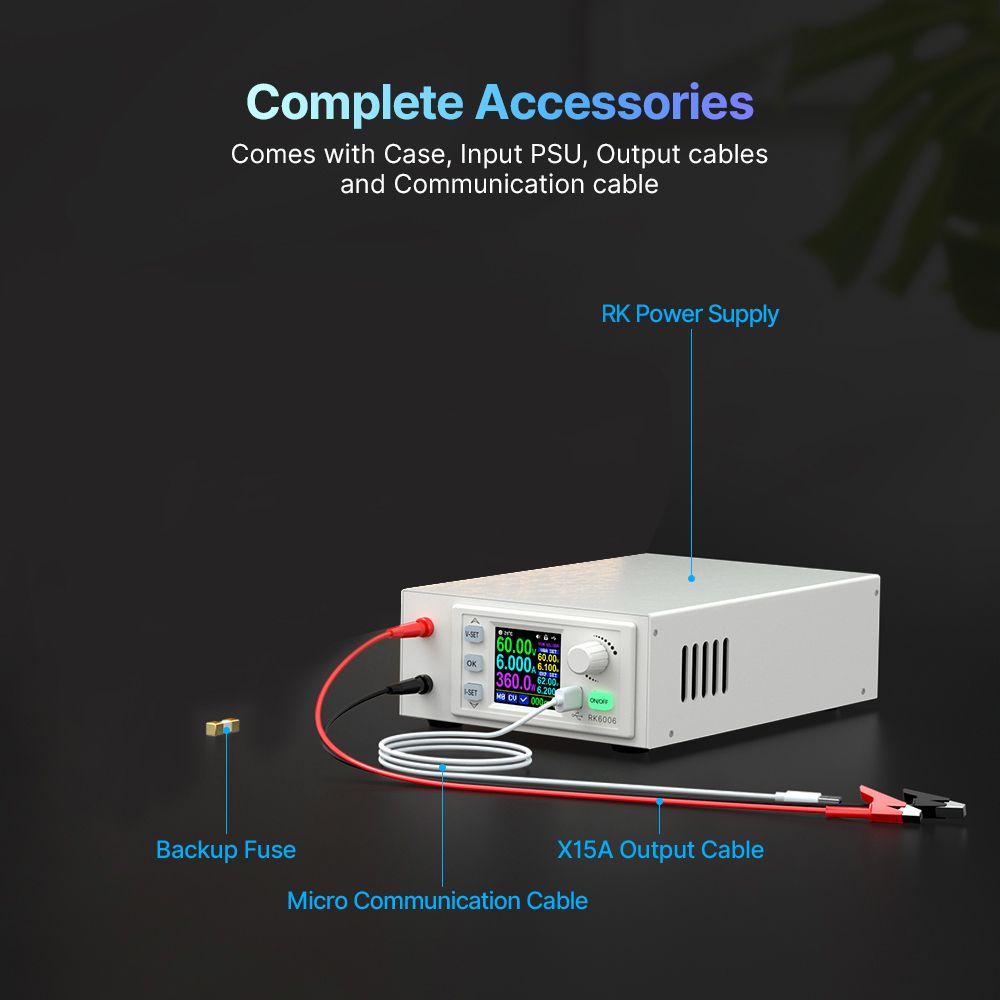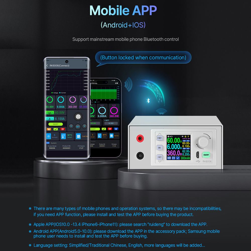 This constant voltage and constant current maintenance experimental supplying device have 0-60.00V output voltage, 0-6.000A output current, 360.0W output , 1.54inch LCD digital displays, clearer display, and more accurate measurement. Supports USB + BT communication, and it supports mainstream models of mobilephone BT online control (automatic locking of keys during communication). Support mobilephone APP connection control. Support 10.0-16.0 iOS system and 5.0~12.0 Android system. Support firmware upgrades to ensure that the product is constantly updated and optimized to obtain new functions and enhance the usefulness of the product.