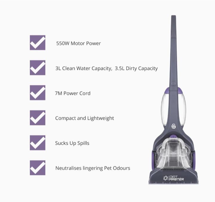 The Swan Dirtmaster Carpet Cleaner makes washing carpets a whole lot easier! Large capacity tanks for clean and dirty water help ensure extra cleaning for longer, without the need to empty and refill. While sucking up spills and removing stains, our carpet washer vibrating brush technology also works to effortlessly loosen and lift dirt for a deeper and more long-lasting clean. The Swan Dirtmaster Carpet Cleaner is also specially designed to neutralise any lingering odours or smells, leaving your home looking and feeling completely fresh!