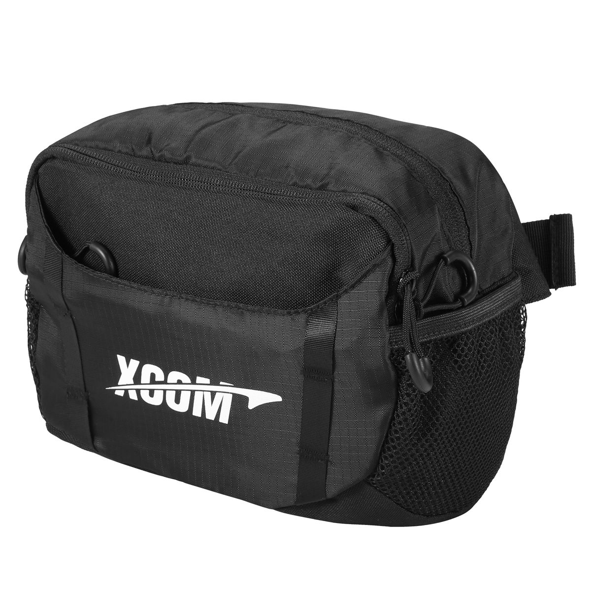 Features a front zipperd pocket,a middle pocket,a mian compartment with a inner slot and two side mesh pockets.