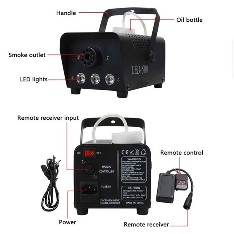 Product name: Smoke machine Color: Black Size: Approx. 240x122x115mm/9.44"x4.8"x4.3" Voltage: 220V-230V/110V/120V, 50-60Hz Warming-up time: 4-5 minutes Power: 500W Oiler capacity: 0.4 liters Tank Capacity: 0.5L Smoke outpul: 3000 cufl/min Output Distance: 2.5m Controller: Wireless remote control 10 meters Protection class: IP20 Light source type: LED Plug: US Plug, EU Plug, UK Plug Weight: 1819g Package Include: 1x Smoke machine 1x Power cable 1x Control box 1x Remote control 1x Handle 2x Mounting screws 1x User manual 1x Box Note: Disco Fog Liguid (which is for producing fog) Not included dear,when you need ship to Spain,and the city Zip code beginning of 35,38,51,52 is can not ship from Spain,if ship from Spain is need additional charge 14$ ,pls know that,