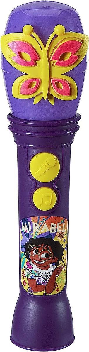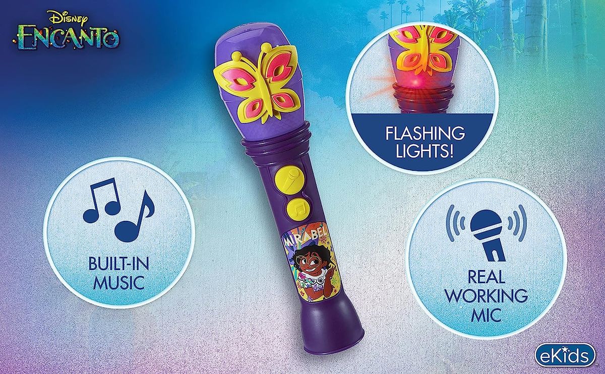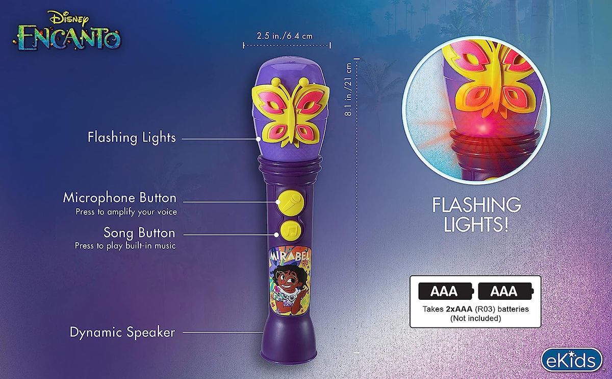 Get ready to sing, dance, and clap along to your favorite song from Encanto! This Disney microphone for kids includes a clip of the song ‘The Family Madrigal' from the popular new film. With a built-in light show and kid-friendly controls, this toy microphone makes it easy and fun to perform for friends and family. Take this lightweight and portable musical toy anywhere and everywhere!. Toy microphone for kids, Includes music from Encanto , Built-in flashing light show, Disney toys make a great gift.