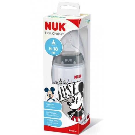 The NUK First Choice+ Baby Bottles with Temperature Control show at a glance when the right drinking temperature is reached. The scale on the bottle changes colour depending on the temperature of the contents. If too hot, the normally blue indicator turns white. Important: NUK Temperature Control is intended as an additional check. Therefore, the temperature should still be checked manually before actual feeding. To check the temperature of the contents, put a few drops on the inside of your wrist.The original NUK teat is modelled on a mother & rsquo;s nipple as she breastfeeds and is therefore accepted well by babies. This means that it is specially suited for babies who are both bottle and breastfeed. Giving tongue and jaw enough room - and the feeling babies love. With its soft zone, the tip of the silicone teat nestles optimally against your baby & rsquo;s palate & ndash; for a natural feeling while drinking. The NUK Anti-Colic Air System ensures a natural flow to help your baby drink without swallowing air. For a happy little tummy.* Baby bottle made from light, shatterproof polypropylene, free from harmful substances, odourless and BPA-free. Easy to fill and clean, extra-wide bottle neck, safe grip and stable & ndash; through slightly contoured shape of bottle with wide base. Practical NUK Temperature Control display that changes colour from blue (cool) to white (too hot). Can be combined with all NUK First Choice products.