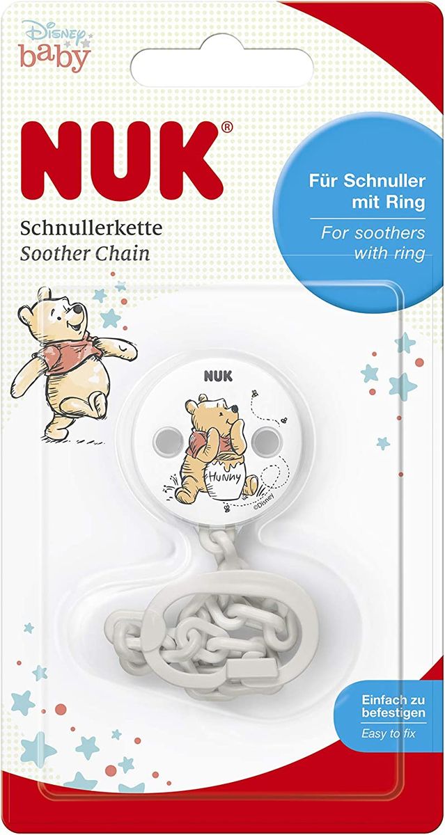 You can certainly know how sucking is for babies and how much fun they have with their soothers,soother chain are a great way to making a soother stay where they belong and not to get lost or fall on the floor.The Nuk soother chain has a particular clip for easily attaching the chain to your baby's cloth there is also a hook device which makes it simpler to.