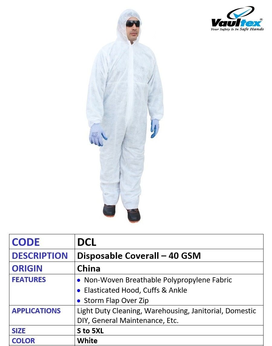 FEATURES : 40 Gsm, Non Woven Breathable Polypropylene Fabric, With elasticated Hood, Cuffs and Ankles, Storm flap over zip.APPLICATIONS : Light Duty Cleaning, Warehousing, Janitorial, Domestic DIY, General Maintenance etc.COLOR : WhiteSIZES : S - 5XL