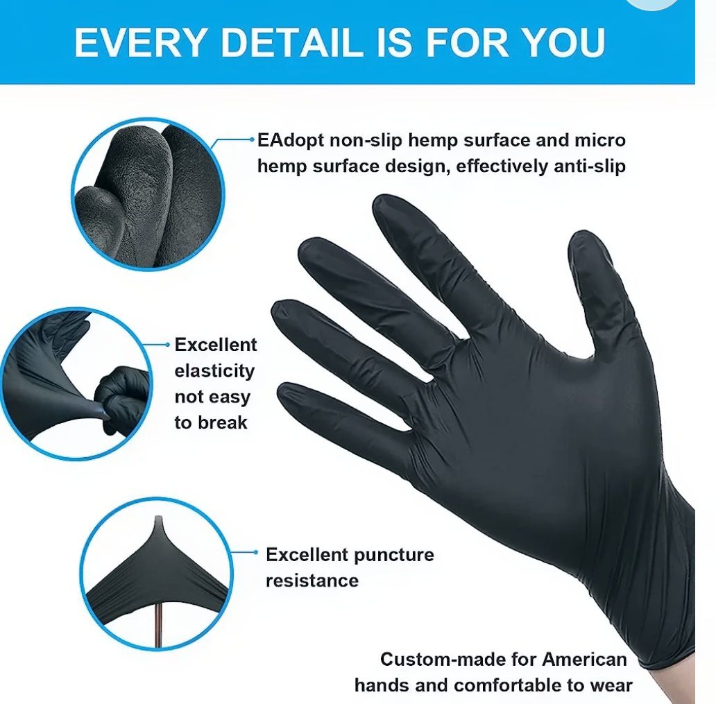 Disposable Black Hand Gloves - Latex Free, Chemical + Puncture Resistant, Textured Grip, Single Use..