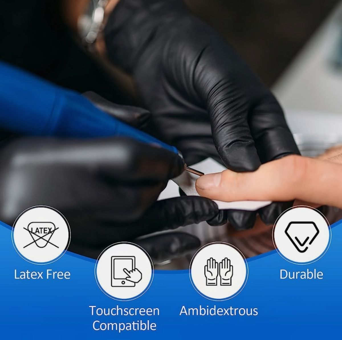 Superior strength and puncture resistance compared to latexFlexible and comfortable fit with a textured gripLatex-free, protein-free, and allergy-freeHigh level of tactile sensitivityFlexible and comfortable fit with a textured gripLightweight and breathable materialChemical protection and resistanceProfessional sleek appearance in black color