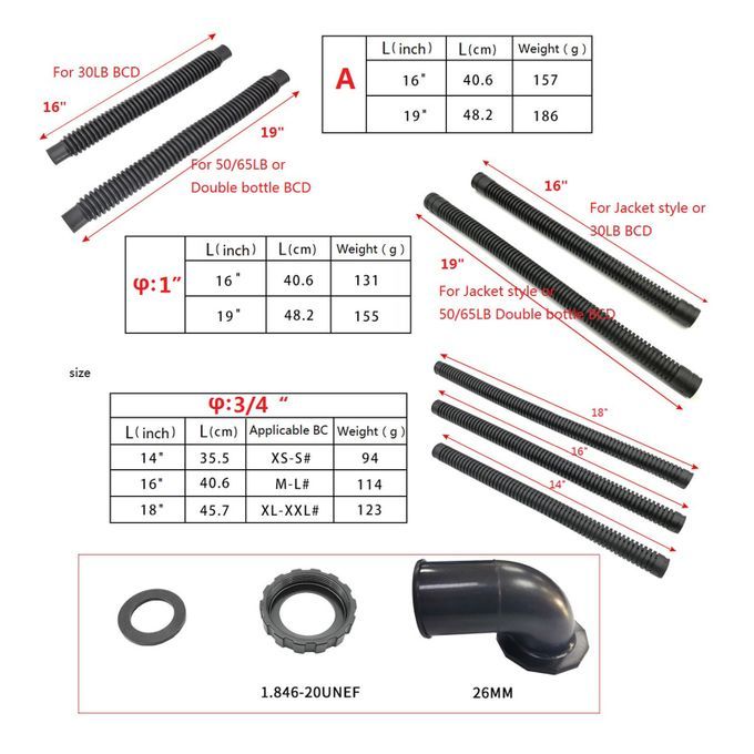 The 1 inch inner diameter 16 inch long hose fits for 30lb BCD wing or jacket BCD; 19 inch fits 50lb/65lbs double BCD wing and jacket BCD