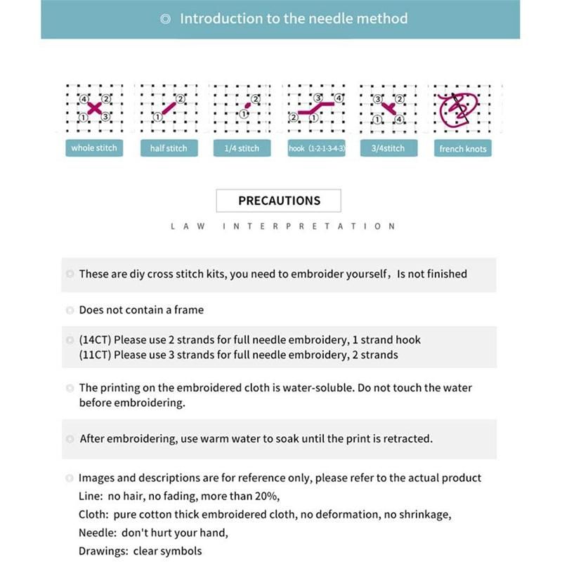 [Notes](11CT) use 3 strands for full .2 strands threads for back . After finishing. put the pattern in warm water for 20 minutes.then dry.and then you can make a for it as you like.Important: do not the -stamped pattern wet you finish it because it is washable. Color blocks on the printed pattern are color of the floss. be to use the colored tread according to the symbols.