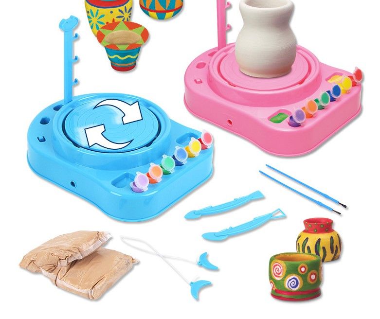 Pottery wheelPropSculpture tools X 2Cutting cord with handleSix colours pigmentsPaintbrush X2Clay X 2 (800g)