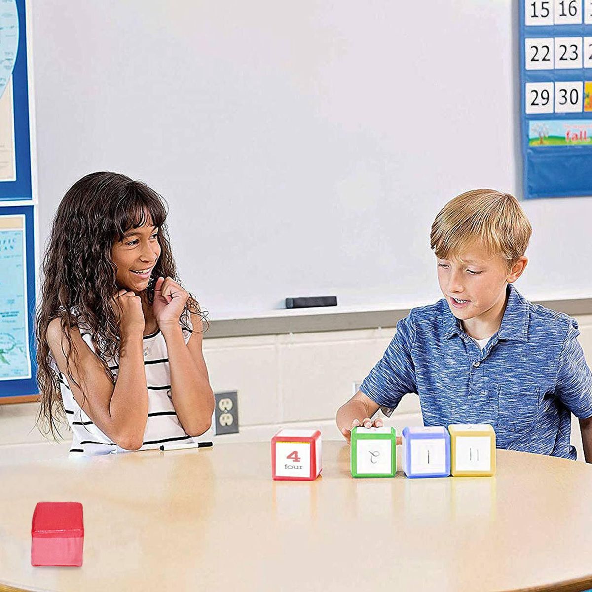 Four rolling dice can be used to practice everything from math skills, ABC, shapes to sentence combinations.